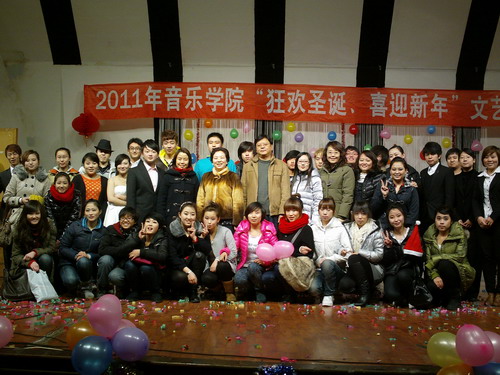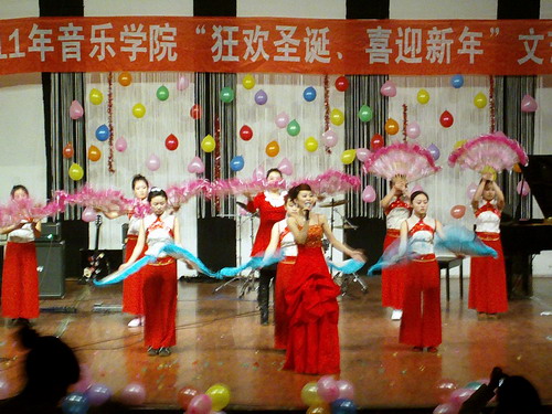 联欢会在《铃儿响叮当》的轻快声中拉开帷幕。此次晚会的节目类型丰富多彩,歌舞、小品、话剧、萨克斯演奏等节目让人赏心悦目,同学们纷纷展示着自己的才华与风采。其中小品《母亲》把整台晚会推向了高潮,传达了感人肺腑的亲情,无私奉献的母爱引起了全场观众的深深共鸣;话剧《灰姑娘》,轻松幽默,赋予经典童话以时尚前卫的诠释,博得了大家阵阵笑声与喝彩;《让世界充满爱》礼仪模特表演,更展现了音乐学子的青春魅力。本次联欢会还得到了教师发展公司的支持,由廉婷等同学带来的街舞表演,也成为了晚会的一大亮点。最终,晚会在由2010级新生原创一首歌曲《My World》中圆满结束。