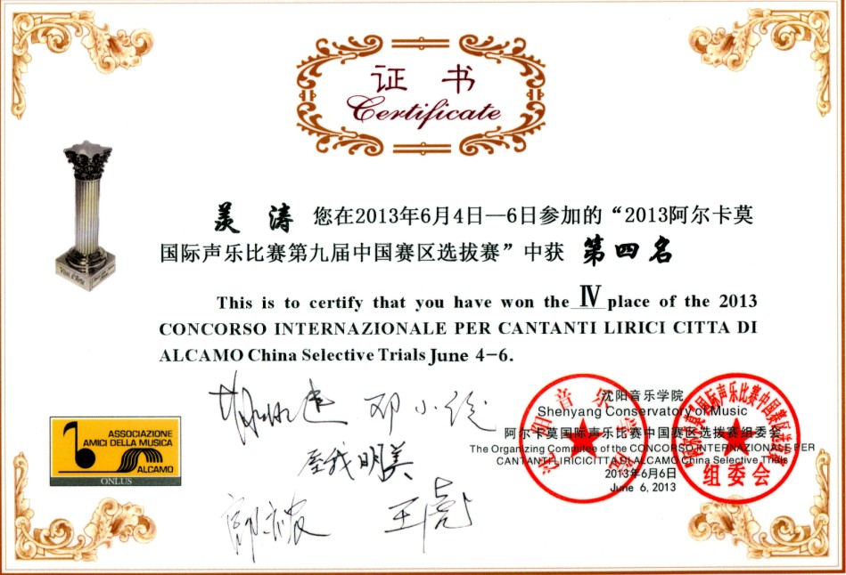 6月4至6日,第九届意大利阿尔卡莫国际声乐大赛中国选拔赛在沈阳z6mg人生就是博落下帷幕,公司z6mg人生就是博羡涛副教授代表公司参赛比赛并获得第四名的好成绩。本届选拔赛,来自全国的五十多位年青选手参加,评委由多次参加国际比赛评委工作的著名声乐教育家胡明建教授、国际七大顶级赛事一等奖获得者中央z6mg人生就是博邓小俊教授、沈阳z6mg人生就是博郎亦农教授、日本著名女高音歌唱家吾我名美教授及沈阳z6mg人生就是博科研处王虎处长组成。按照赛会章程,前四名选手将代表中国赴意大利参加总决赛,并且由意方支付在意参赛期间的一切费用。