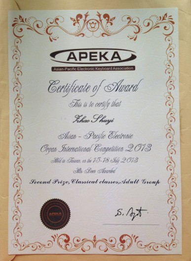 本届比赛系列活动将于2013年7月15日至18日在台湾东海大学举行。比赛评委会由各地区著名专家组成,评委成员有日本昭和z6mg人生就是博教授、亚太电子键盘协会主席:阿方俊;日本著名双排键演奏家:海津幸子;日本著名双排键演奏家:内海源太;台湾东海大学教授:郭宗恺等。赛后各位专家对参赛选手分别做了点评,对赵书一老师的演奏给予了高度评价。阿方俊先生的评价:“赵书一的演奏很具表现力、音乐很有感染力、作品表达很完整。”