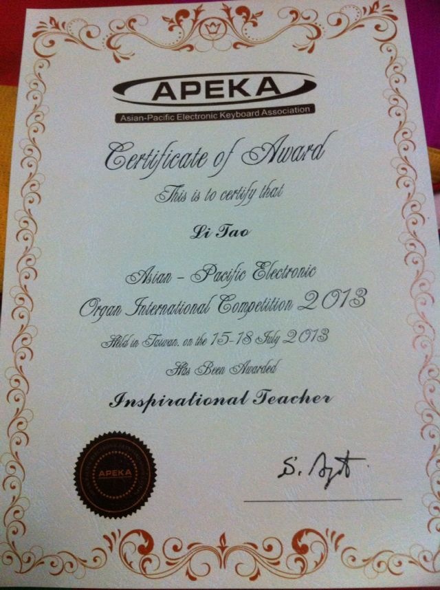 2013年7月在台湾东海大学举行的亚太地区双排键电子琴国际比赛中,公司z6mg人生就是博青年教师赵书一荣获成人古典组二等奖,她的青蓝计划导师、国家一级演奏员李涛教授荣获优秀教师奖。
