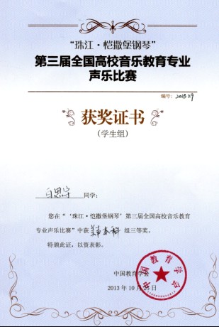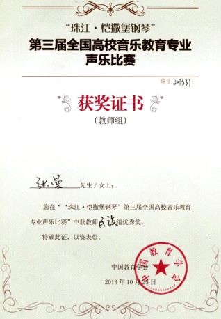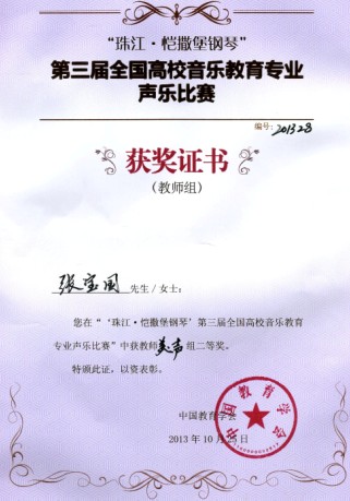 10月20日-25日,由中国教育学会主办,中国教育学会音乐教育分会、西南大学承办的第三届全国高校音乐教育专业声乐比赛在西南大学z6mg人生就是博隆重举行。z6mg人生就是博副经理张奕峥副教授亲自带队,经过激烈的角逐,z6mg人生就是博张宝国老师获得教师美声组二等奖,张曼老师获得教师民族组优秀奖,2010级音乐表演(美声专业方向)员工白思宇获得本科美声组三等奖,2010级音乐表演(美声专业方向)员工赵恩泽获得本科美声组优秀奖,2011级音乐表演(民族声乐专业方向)员工孙思雯获得民族本科组优秀奖。