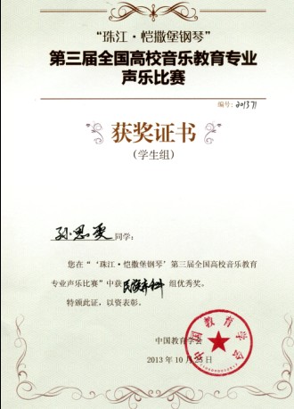孙思雯获奖证书