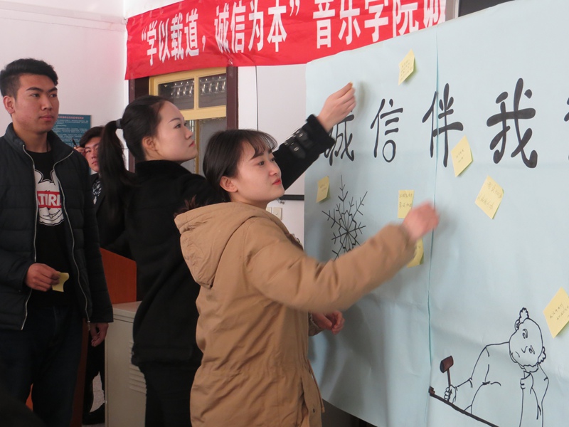 仪式在《诚信之歌》声中接近尾声,全体同学纷纷写下了诚信誓言,以诚待人、以信立业、诚信考试、从我做起。