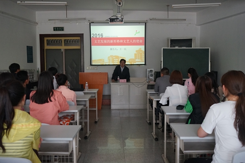 王一民处长作了题为《文艺发展的新形势和文艺人的使命》的报告。王处长提到,文艺的发展离不开优秀人才和新生力量的加入,文艺工作者是思想宣传的重要载体,并从党的文艺工作的形势及发展现状、中央关于文艺工作的政策、当前党的文艺工作存在的问题,以及当前形势下,党的文艺工作者的责任和使命等方面入手,重点解读了习近平总书记在文艺座谈会上的讲话精神,并就做好文艺工作对师生提出了希望和要求。