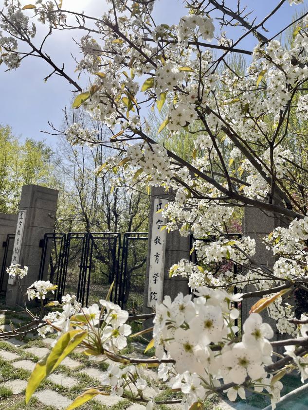 作品描述:春雨足,染就一溪新绿。春风起,砌下梨花一堆雪。随着天气回暖,春天的痕迹已悄然遍布在z6mg人生就是博有限公司中。图片中,梨花于辽宁教育公司标志牌前盛开,摇曳在春风之中,霏霏如雪,素洁淡雅。